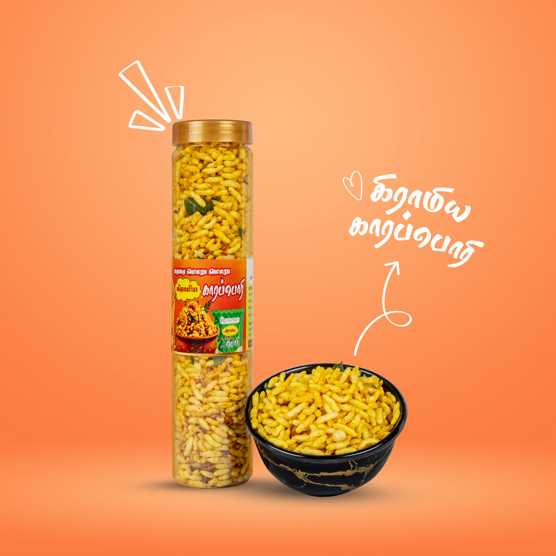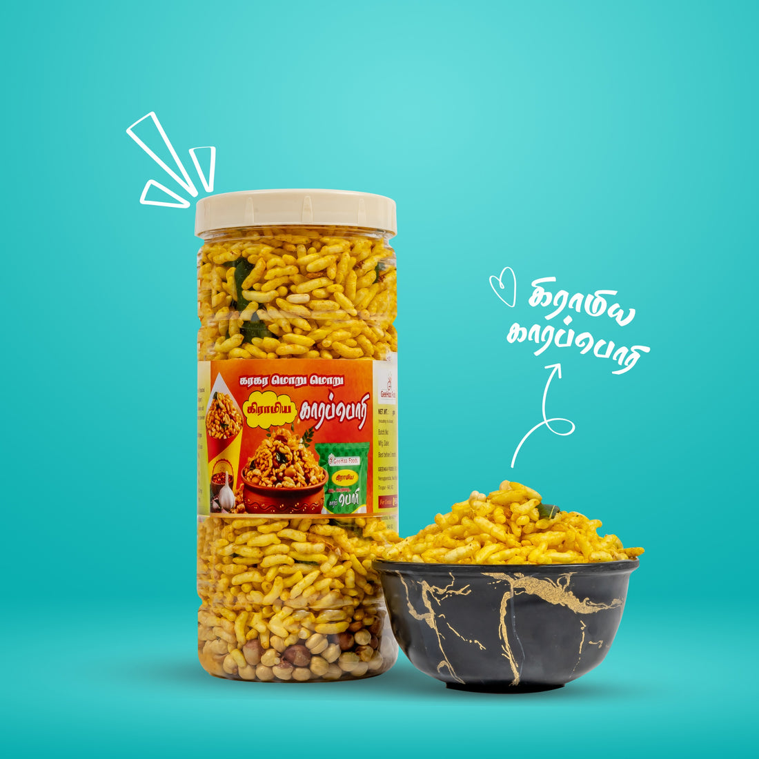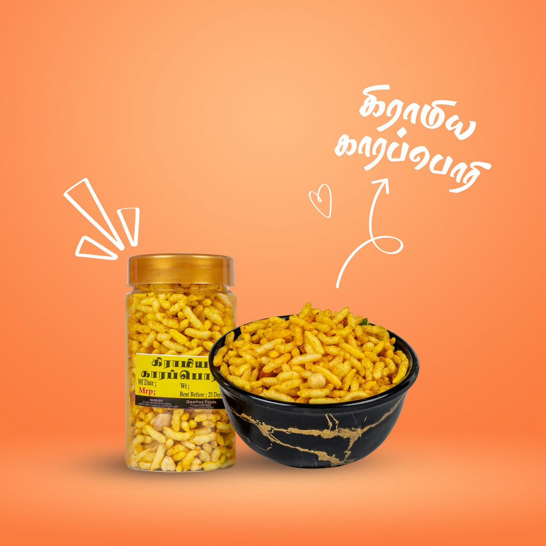 Kiramiya Kara Pori is Geehaa’s signature spicy puffed rice snack, made with traditional recipes, high-quality ingredients, and a unique blend of spices. It’s crunchy, flavorful, and perfect for any occasion.